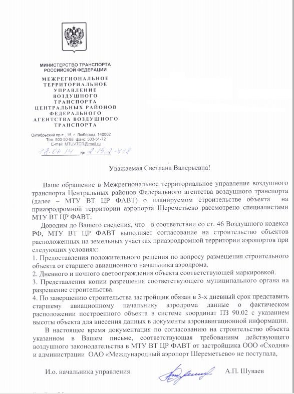 Намерение не использовать объект под заявленные цели косвенно подтверждается ответом представителя собственника гражданского аэродрома Шереметьево - МТУ Воздушного транспорта центральных районов Федерального Агентства воздушного транспорта от 18.06.2014 №2-15.2-718, свидетельствующим о том, что документация по согласованию данного объекта от застройщика ООО "Сходня" не поступала.