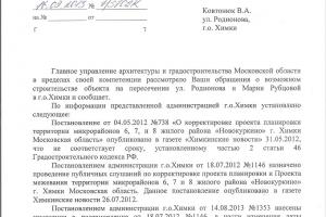 Защитниками сквера в Новых Химках на ул. Родионова получен ответ по их жалобе на планируемую незаконную застройку этого места огромным жилым комплексом. Ответ прислал министр архитектуры и градостроительства Воронцов:...