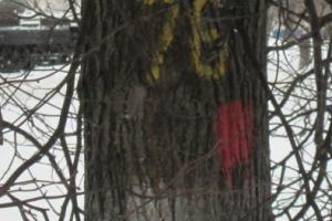 В сквере Марии Рубцовой жители заметили красную разметку на деревьях....
