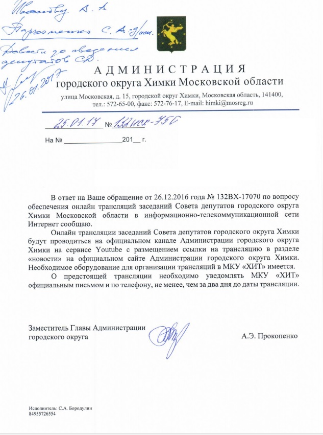 Заседания совета депутатов г.о. Химки будут обеспечены онлайн-трансляцией, сообщает химкинская администрация. Трансляция будет вестись через канал Youtube.com, а ссылку на нее во время заседаний разместит сайт администрации г.о. Химки admhimki.ru в разделе "Новости". Такое сообщение получили депутаты от замглавы Химок.