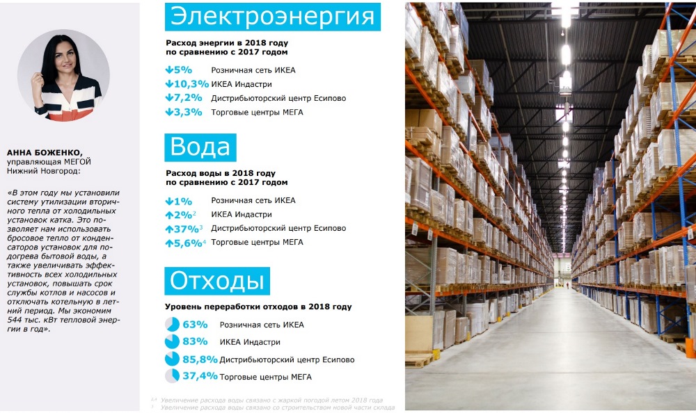 Тренд экологии в бизнесе можно наглядно увидеть на примере известной компании IKEA. Бренд ежегодно публикует отчеты по устойчивому развитию, где отображены цифры по экономии электроэнергии и воды с помощью энергосберегающих технологий, реализуемых компанией на рынке. Так за отчетный 2018 год компания продала более 2,73 миллиона энергосберегающих лампочек и 83 тысячи смесителей с аэратором. Подобных примеров в отчетах множество. Также в документах наглядно показано, как компания использует технологии переработки своей продукции для вторичного использования сырья или примеры запуска технологий замкнутого цикла. За прошедший год IKEA переработала более 50 тонн постельного белья, запустила собственное производство на основе возобновляемых источников энергии (фабрики с энергоустановками на биотопливе суммарной мощностью 85,5 МВт) и т. д.