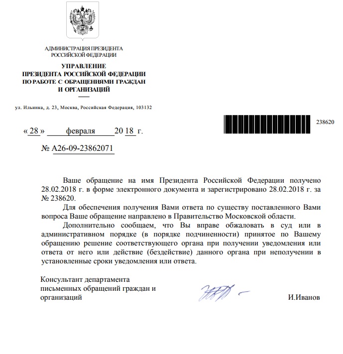 Администрация Президента РФ перенаправила данное заявление на рассмотрение в правительство Московской области. Оттуда его переслали в администрацию Солнечногорского района и в Главахитертуру Московской области. Будем ждать ответа.
