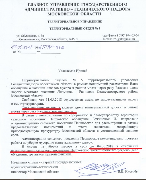 По жалобам жителей Радищево инспекторы Госадмтехнадзора Московской области проверили берег реки Радомли (в районе мостика) - и зафиксировали навалы мусора. Помойку предписано убрать до 4 июня. Если администрация с.п. Пешковского этого не сделает, ее могут привлечь к ответственности.