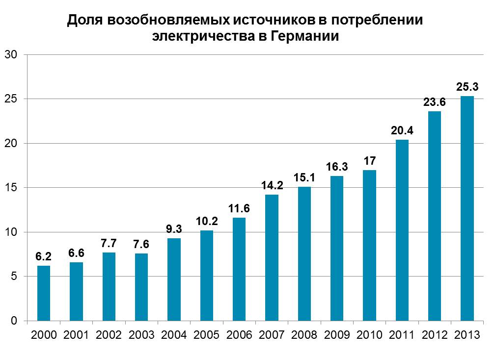 Из-за перестройки стоимость энергии в Германии постоянно растет. Киловатт-час стоит около 26 центов (19 рублей) - в два раза дороже, чем в 2000-м. При этом поддержка Energie-Wende как среди населения, так и среди компаний - больше 70%. В Германии устоялось осознание проблем глобального потепления и их связи с выбросами парниковых газов. И вера в то, что проблемы можно решать, не ожидая поддержки большинства стран. Вероятно, свою роль играет и то, что альтернативная энергетика быстро создает новые рабочие места: уже в 2010 году в этом секторе было занято 370 000 человек (в основном - малый и средний бизнес). Это примерно в два раза больше, чем число сотрудников "Роснефти" и ее дочерних обществ в России. Вероятно, альтернативная энергетика играет важную роль в том, что уровень безработицы в Германии остается существенно ниже среднеевропейского.