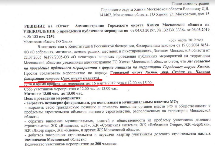 Кроме того, организаторы митинга подали главе Химок Дмитрию Волошину заявку на протестное шествие. Его дольщики хотят устроить в Химках на следующий день после митинга, 17 марта.