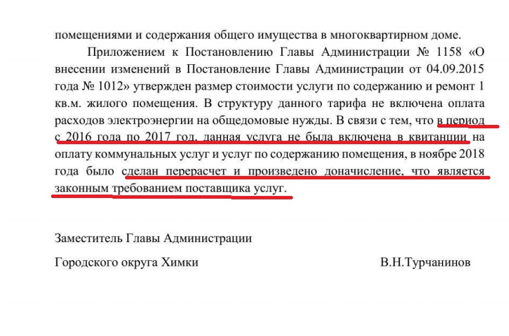 Жители ул. Строителей, 3 получили ответ от администрации Химок на свою жалобу о начислении сомнительных долгов за услуги ЖКХ. По мнению замглавы Химок Виталия Турчанинова, дополнительные суммы, добавляемые в платежки с ноября, полностью законны. Ведь в 2016 году жители не оплачивали электроэнергию, потребленную для общедомовых нужд (ОДН). Настала пора взыскать эти долги.