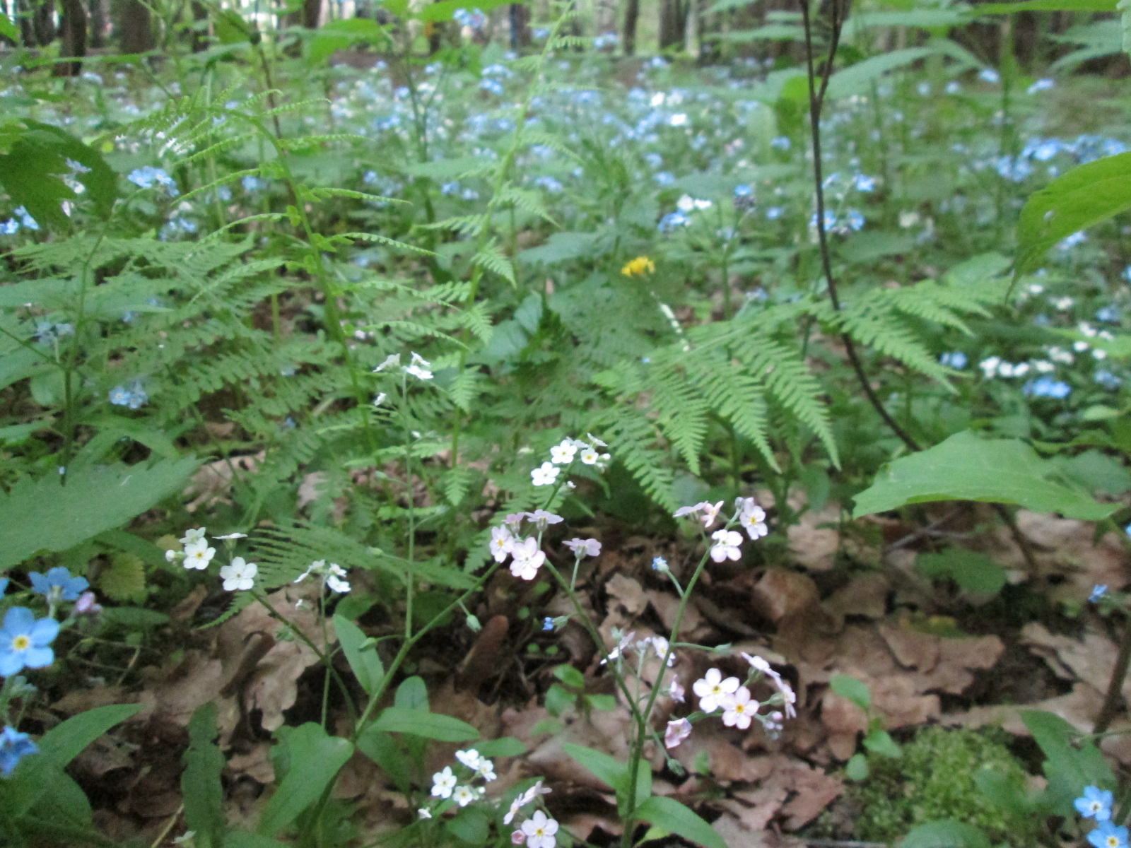 Зато там, куда газонокосилки не добрались, - совсем другая ситуация: цветут незабудки и ландыши, зеленеют папоротники.