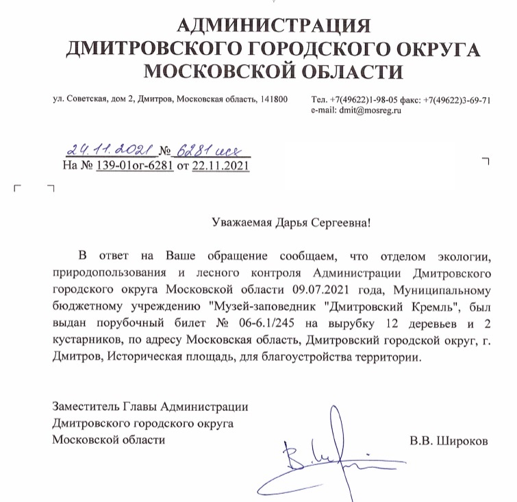 Жители Дмитрова получили ответ на свою жалобу, касающуюся вырубки деревьев на территории одного из древнейших исторических памятников Подмосковья - Дмитровского Кремля. Из документа следует, что летом этого года деревья были спилены законно, согласно порубочному билету, который утвердили местные чиновники.
