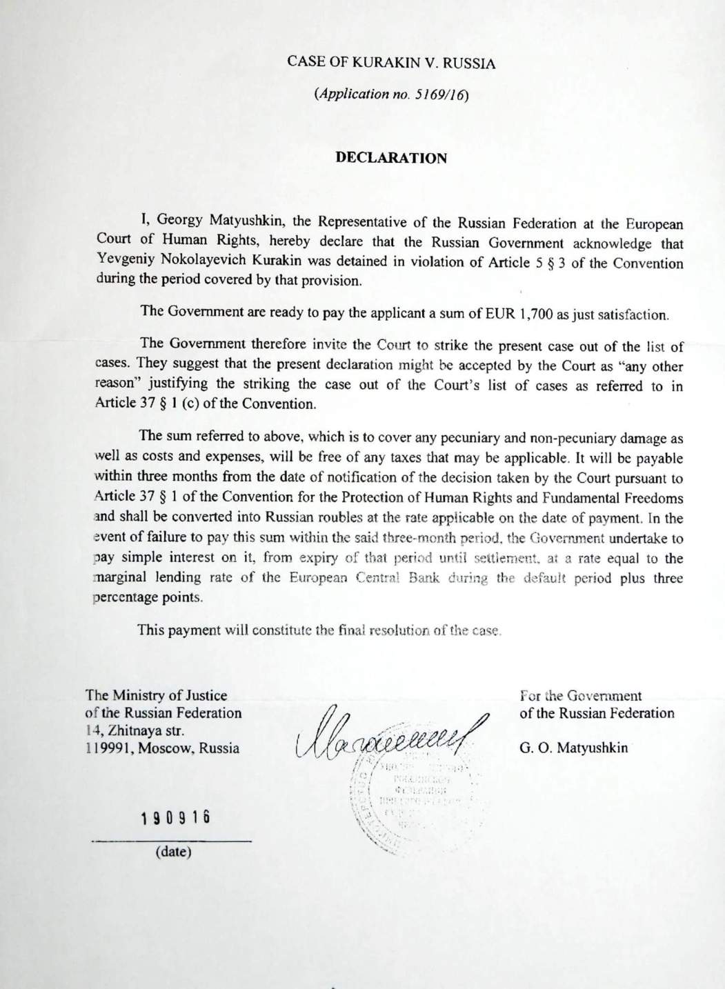 Интересно, что российский Минюст в процессе коммуникации жалобы... признал, что права Куракина были действительно нарушены! Правда, предложенная им компенсация выглядит смехотворной - всего 1700 евро.