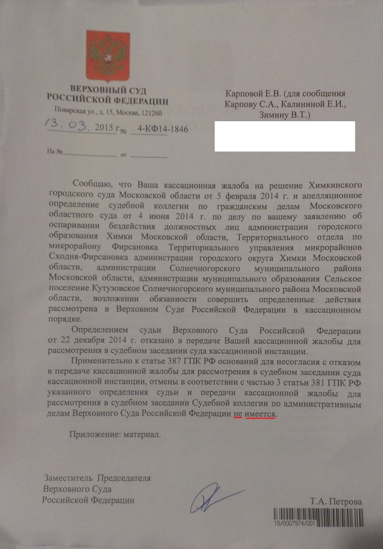 Итак, в жалобе по факту бездействия химкинских властей, не желающих восстанавливать водоотводный ров, Президиум Верховного суда отказал.