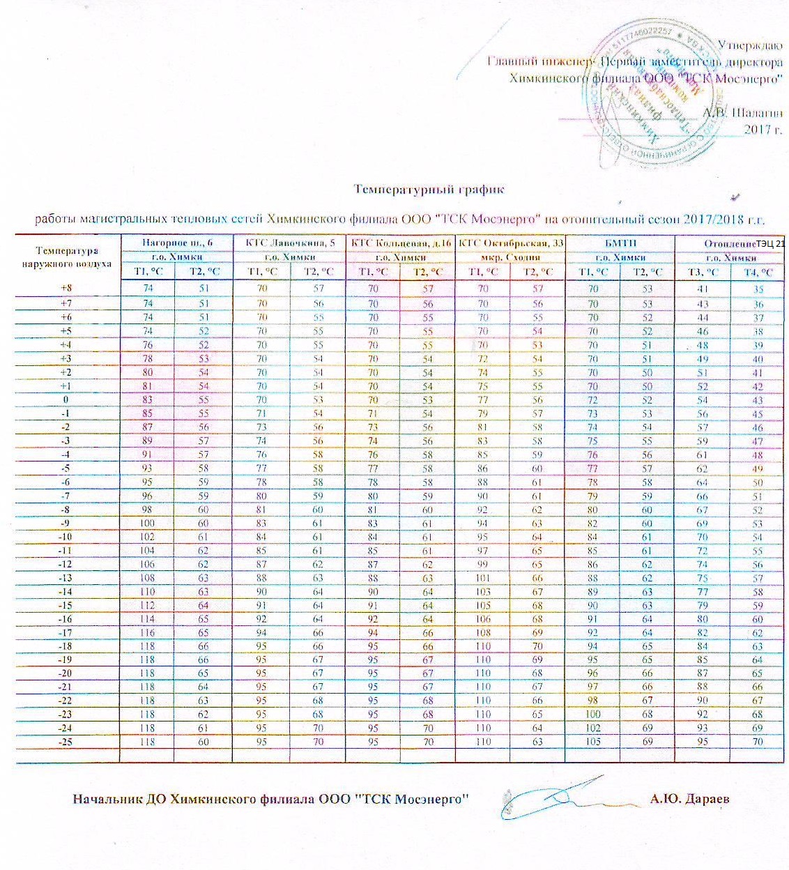 Жителям Химок удалось раздобыть важный документ - график отопления многоквартирных домов в зависимости от температуры наружного воздуха. Этот документ был утвержден ТСК "Мосэнерго" на сезон 2017 - 2018 годов, однако вряд ли правила с тех пор изменились.