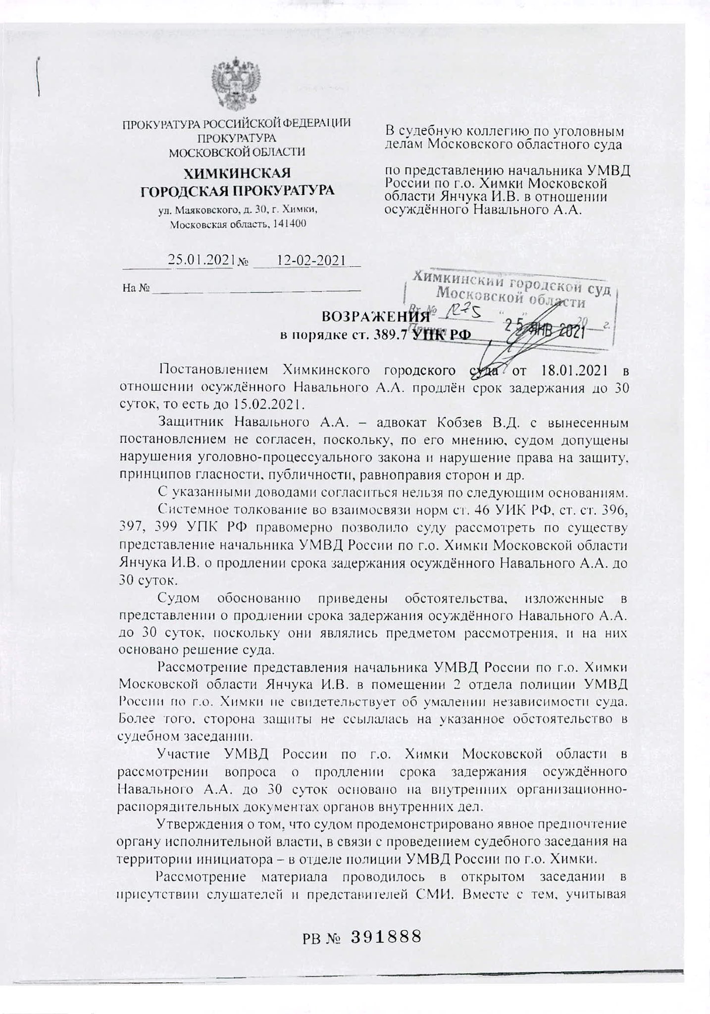 Адвокаты Алексея Навального, который на прошлой неделе был взят под стражу Химкинским судом, обжаловали его арест в городскую прокуратуру. В своем заявлении они, в частности, указали на грубые процессуальные нарушения судебного производства, которое осуществлялось прямо в отделении полиции г.о. Химки.