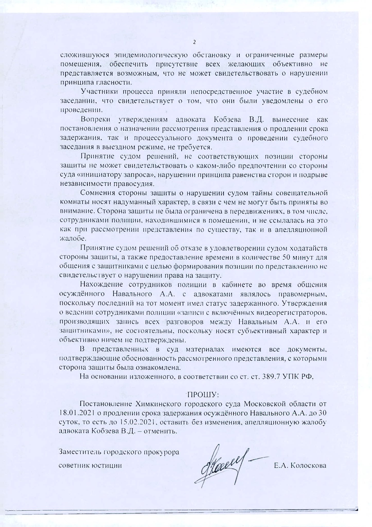 Эта же сотрудница прокуратуры Колоскова участвовала в "выездном" судебном заседании, по итогам которого Навальный уехал в СИЗО. По свидетельствам очевидцев, она возражала на ходатайства защитников о допуске СМИ на судебный процесс и о выделении дополнительного времени для общения Навального с адвокатами. В конце заседания Колоскова попросила удовлетворить представление о задержании Навального.