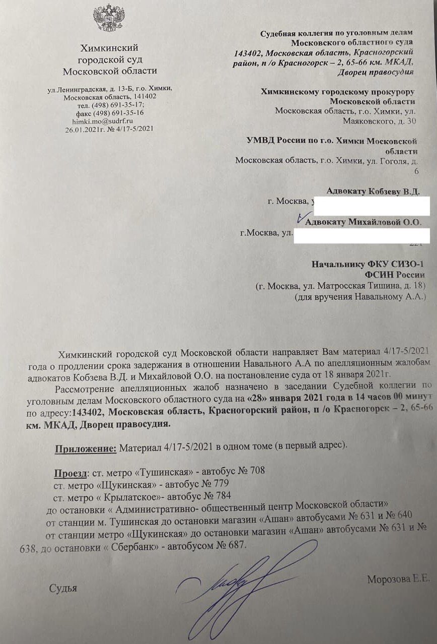 28 января, в 14:00, Мособлсуд в Красногорске будет рассматривать апелляционную жалобу на решение об аресте Алексея Навального.