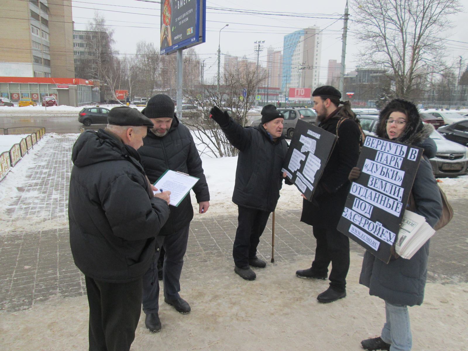 Вчера в парке "Дубки" снова проходила акция в его защиту. Активисты с плакатами стояли рядом с парком и, как всегда, беседовали с прохожими, раздавали агитационный материал, собирали подписи.