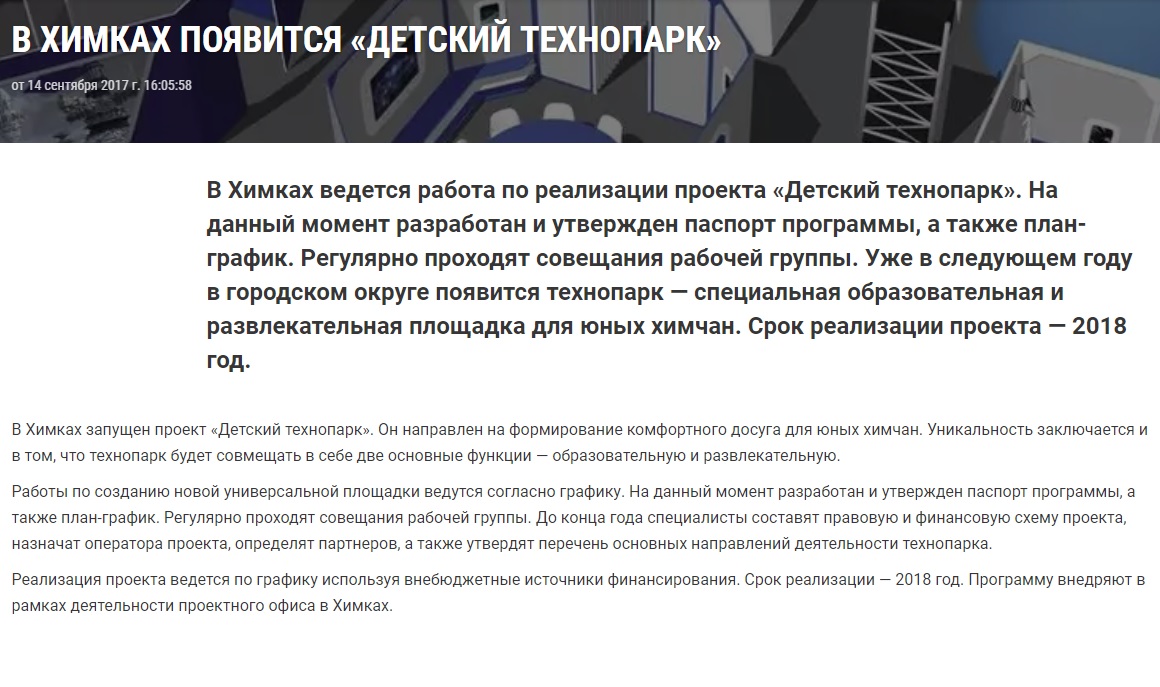 14 сентября на сайте химкинской администрации появилась новость о проекте "Детский технопарк":