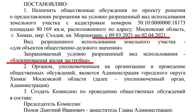 Глава Химок Дмитрий Волошин назначил проведение общественных обсуждений по дальнейшему использованию территории Морщихинского поля в Сходне. На участке площадью около 8 гектаров планируется разрешить "блокированную жилую застройку".
