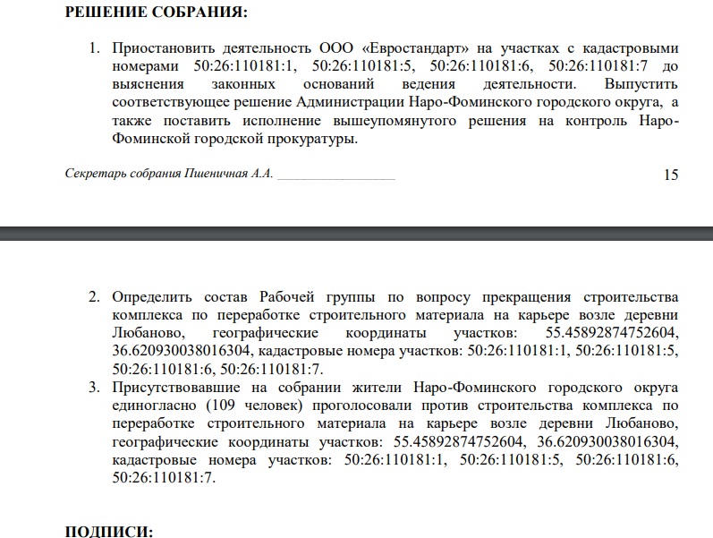 По результатам встречи жители единогласно выступили против проекта. Было решено приостановить работы и сформировать рабочую группу для прекращения и отмены строительства ООО "Евростандарт".