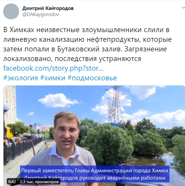 Замглавы Химок Дмитрий Кайгородов, однако, ссылается на неких "злоумышленников", которые слили нефтепродукты в ливневую канализацию "Химводостока".