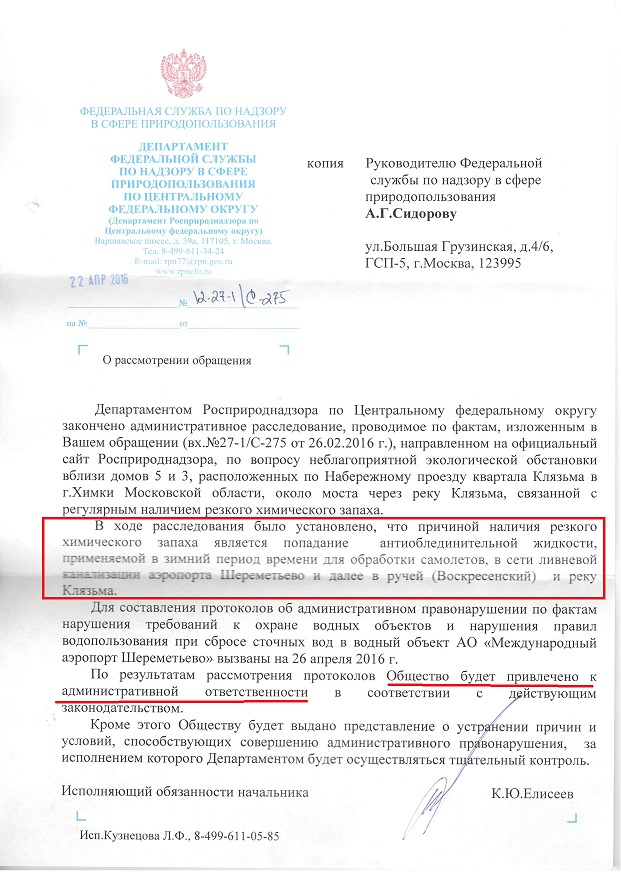 Еще год назад представители Росприроднадзора в результате проверки зафиксировали бурный поток пенистых сточных вод с резким химическим запахом, сливающийся в реку Клязьму из бетонного коллектора. Оказалось, что в реку попадает антиобледенительная жидкость для самолетов и что причастен к данному нарушению аэропорт Шереметьево, который пообещали привлечь к ответственности.