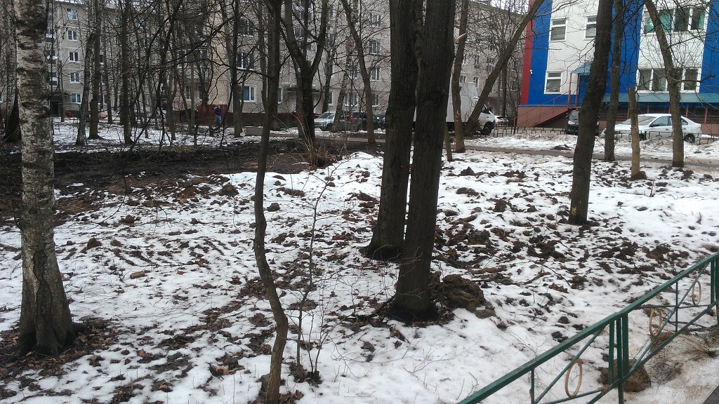 "В Химках, на ул. Лавочкина, 5 идет очистка придомовой территории от деревьев. Последние пару месяцев регулярно появляются рабочие и глубоко что-то копают - 1-2 раза в неделю. На месте их работ остаются пни. В результате за это время образовалась ровная площадка, свободная от растительности, 40-60 кв. метров. Окружающие ее деревья подрублены. Старшая по дому пыталась выяснить, что происходит - куда только ни звонила, нигде не может добиться ответа. Возможно, идет тихая подготовка к строительству магазина или какого-нибудь "Городского хлеба"? Мы не знаем".