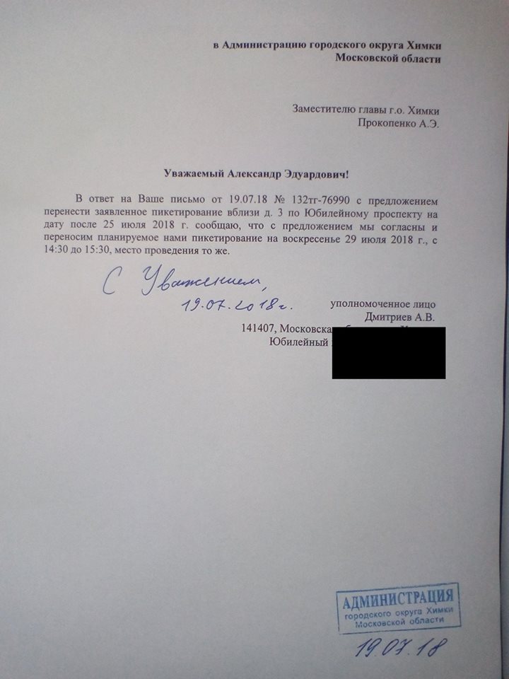 Жителями г.о. Химки подано уведомление в администрацию о проведении пикета в защиту деревьев, против стройки на Юбилейном проспекте, 3.