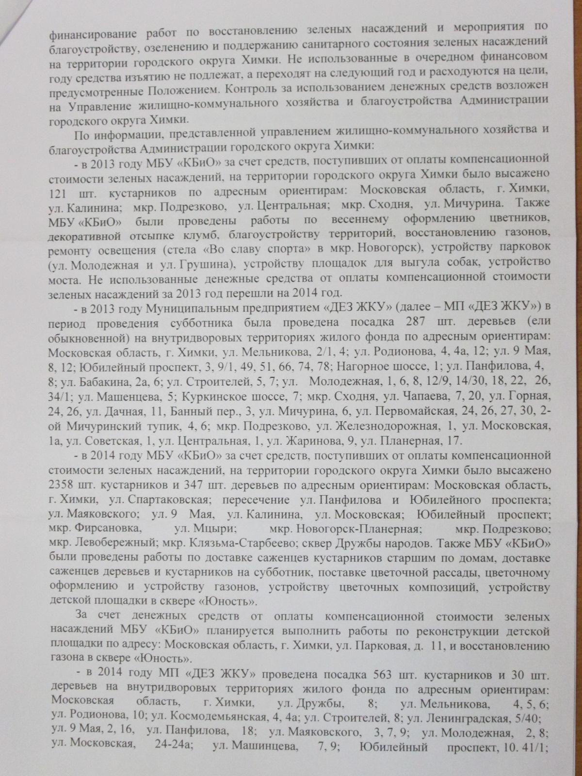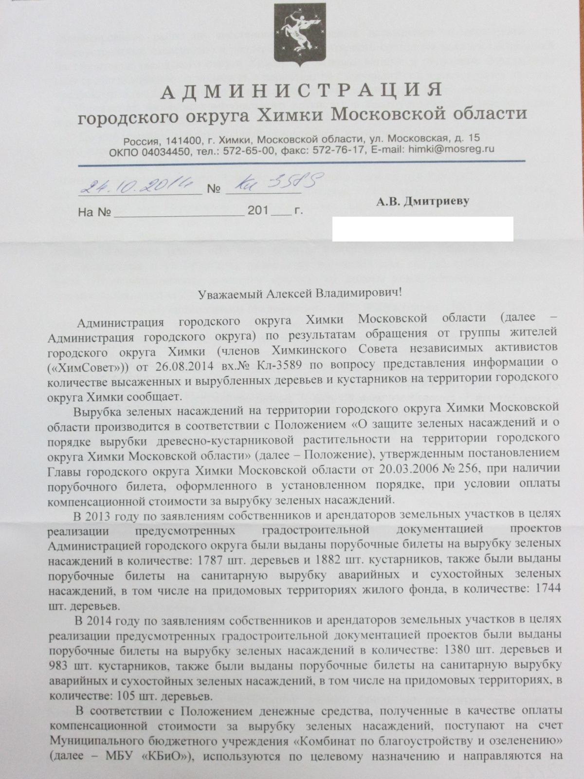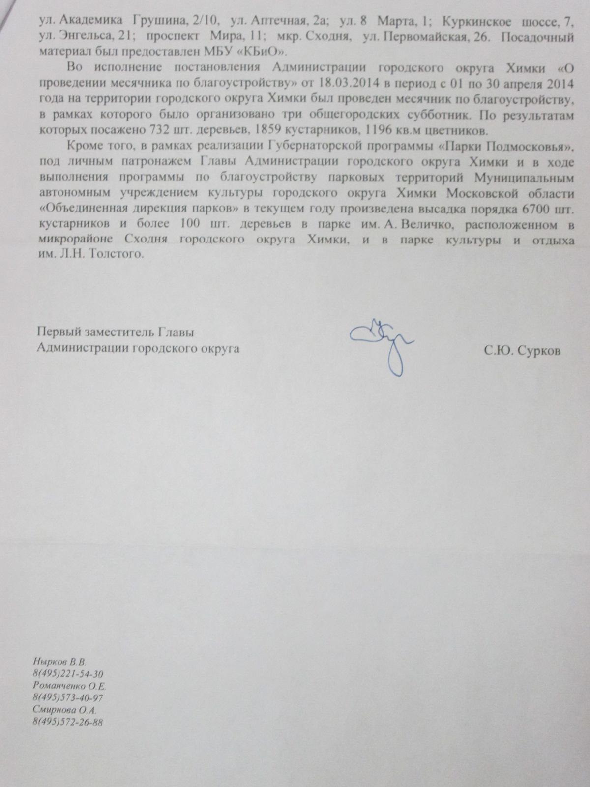 Химсовет некоторое время назад отправил в химкинскую администрацию запрос относительно количества вырубленных и количества посаженных в 2014 и 2013 годах зеленых насаждений. И вот пришел ответ за подписью замглавы Химок Сергея Суркова (ныне ушедшего в отставку и занявшего пост вице-губернатора Ненецкого АО). Исполнителем в ответе указан глава строительного управления Вячеслав Нырков.