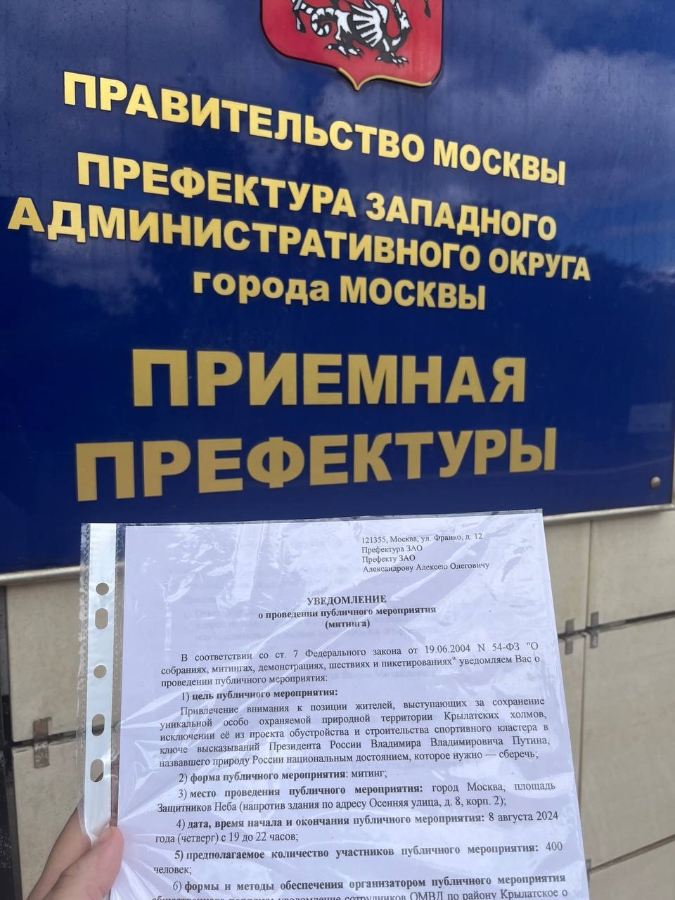 Москвичи, которые отстаивают ООПТ "Крылатские Холмы" от застройки, подали в префектуру заявку на митинг численностью до 400 человек. Об этом пишет Телеграм-канал "Главное: защитим Крылатские Холмы". Если все сложится, жители Крылатского смогут выразить свою гражданскую позицию вечером в четверг, 8 августа, на площади Защитников Неба.