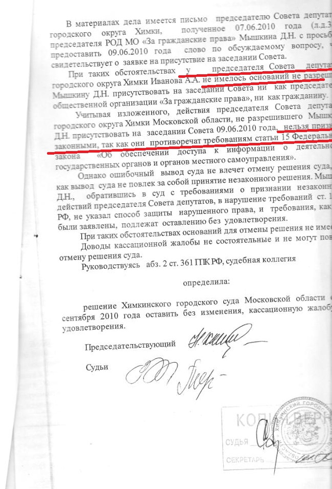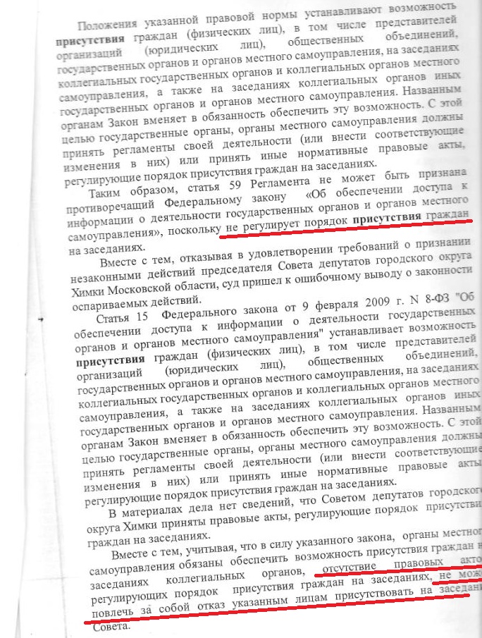 Жители Химок, избиратели имеют право присутствовать на заседаниях местного совета депутатов. Прецедентное решение было вынесено Московским областным судом по иску левобережца Дмитрия Мышкина в 2011 году.