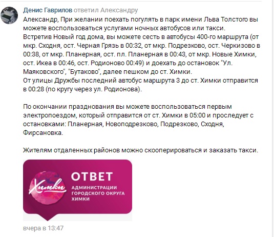 К полемике подключился представитель Объединенной дирекции парков г.о. Химки, который подтвердил, что гуляния и концертная программа будут только в Химках, в парке им. Толстого. В других микрорайонах новогодних гуляний не будет. На возмущенные вопросы людей, как им добраться ночью из микрорайона Сходня в парк Толстого, чиновник администрации посоветовал ехать туда ночным транспортом.