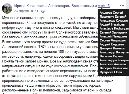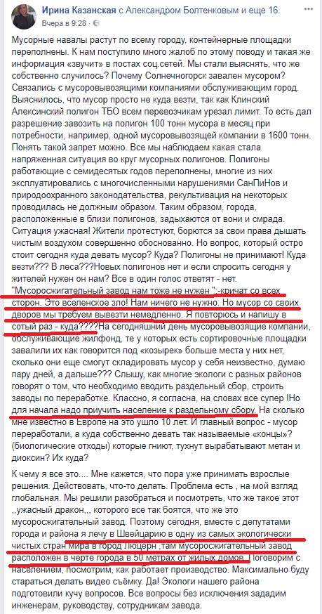 Уже на следующий день утром активистка солнечногорского общественного движения "СВОИ" (того, которое ранее выступало в поддержку объединения района в городской округ) Ирина Казанская опубликовала на своей страничке пост, который выглядит как ответ на этот митинг. Мол, Солнечногорск задыхается в мусорных завалах, вывозить их некуда, так как свалки не принимают отходы, раздельный сбор мусора пока невозможно внедрить и наилучший выход из положения - строительство мусоросжигательного завода. Казанская также сообщила, что едет изучать работу МСЗ в Швейцарию: