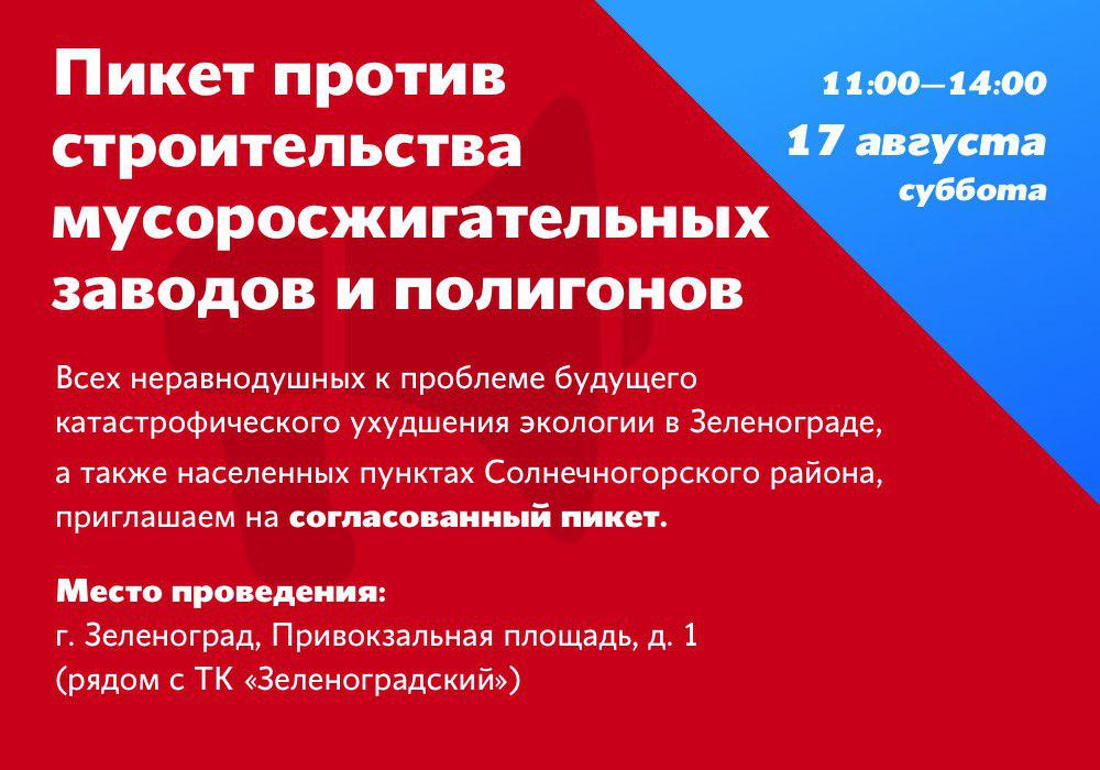 Зеленоградцы и солнечногорцы вновь выходят на протестную акцию в эту субботу. Цель - выразить несогласие с планами размещения гигантских "мусорных" объектов в Солнечногорском районе: полигона ТБО в Поварово и мусоросжигательного завода в Хметьево. Сбор - в эту субботу, 17 августа, в 11:00, на привокзальной площади в Зеленограде.