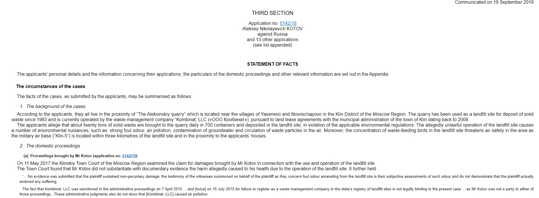 Принятие ЕСПЧ иска клинчан к рассмотрению - уникальный случай за все те 20 лет, что россияне туда обращаются. Ранее иски в связи с нарушением экологических прав жителей России ЕСПЧ рассматривал всего дважды, а на тему мусорных свалок - вообще ни разу. Люди, по всей России выступающие против строительства мусорных полигонов и мусорожигательных заводов рядом со своими домами, сейчас с надеждой смотрят на это дело и желают успеха клинчанам.