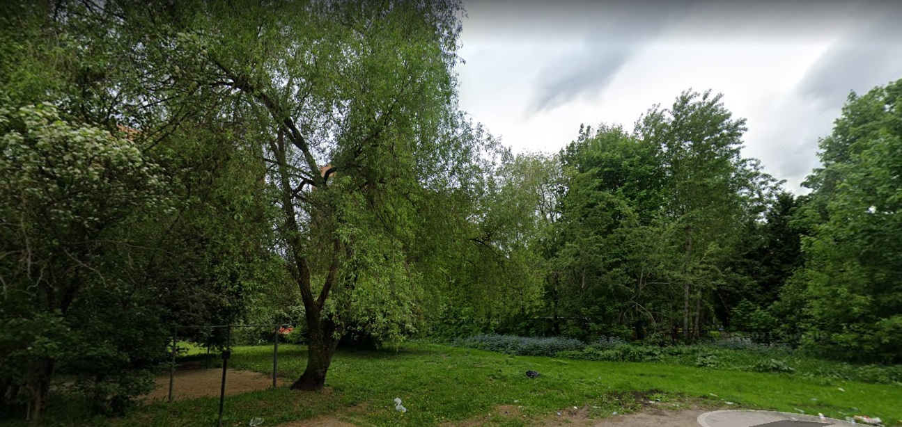 На Яндекс-картах территория предстает озелененным двором с детской площадкой.