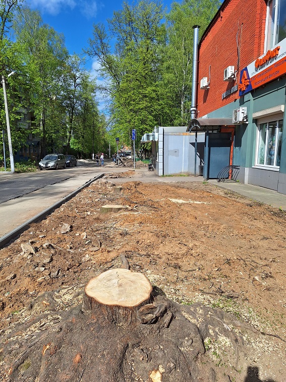 Жители Пушкино сообщили "Экообороне", что в городе появилось множество новых пеньков. На Писаревском проезде часть деревьев спилены, а еще у части - подрублены корни. Инфощита в нарушение правил на месте нет.