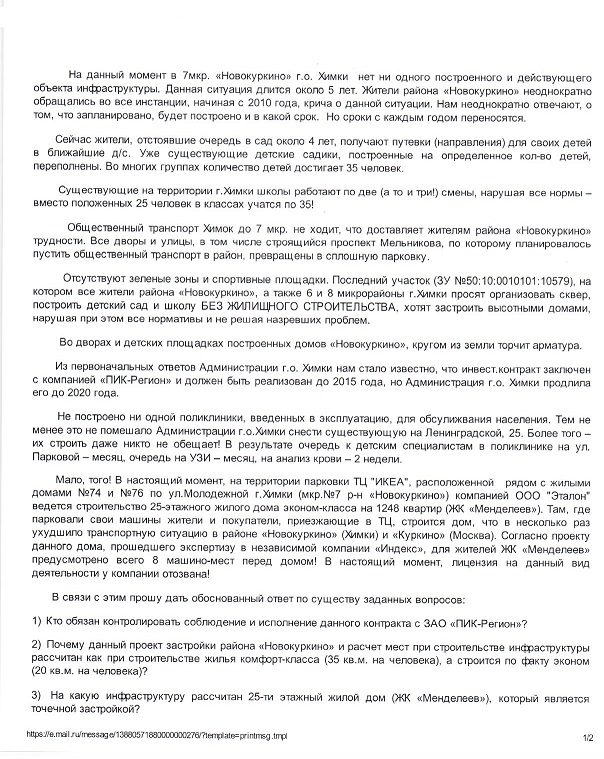 В декабре прошлого года активист Химсовета, житель 7-го микрорайона Химок Сергей Дворянов отправил на почту губернатору области Андрею Воробьеву заявление о катастрофической ситуации в Новокуркино с соцобъектами и зелеными зонами и требованием разъяснить, кто отвечает за такое положение дел: