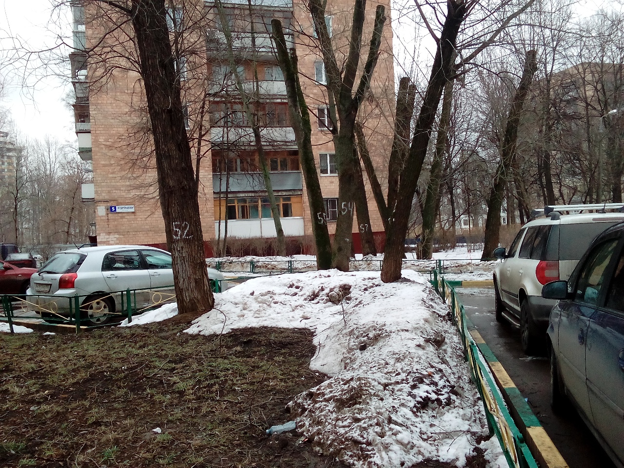 Жители ул. Кудрявцева в Старых Химках заметили, что рядом с домом 5 несколько деревьев пронумерованы белой краской.