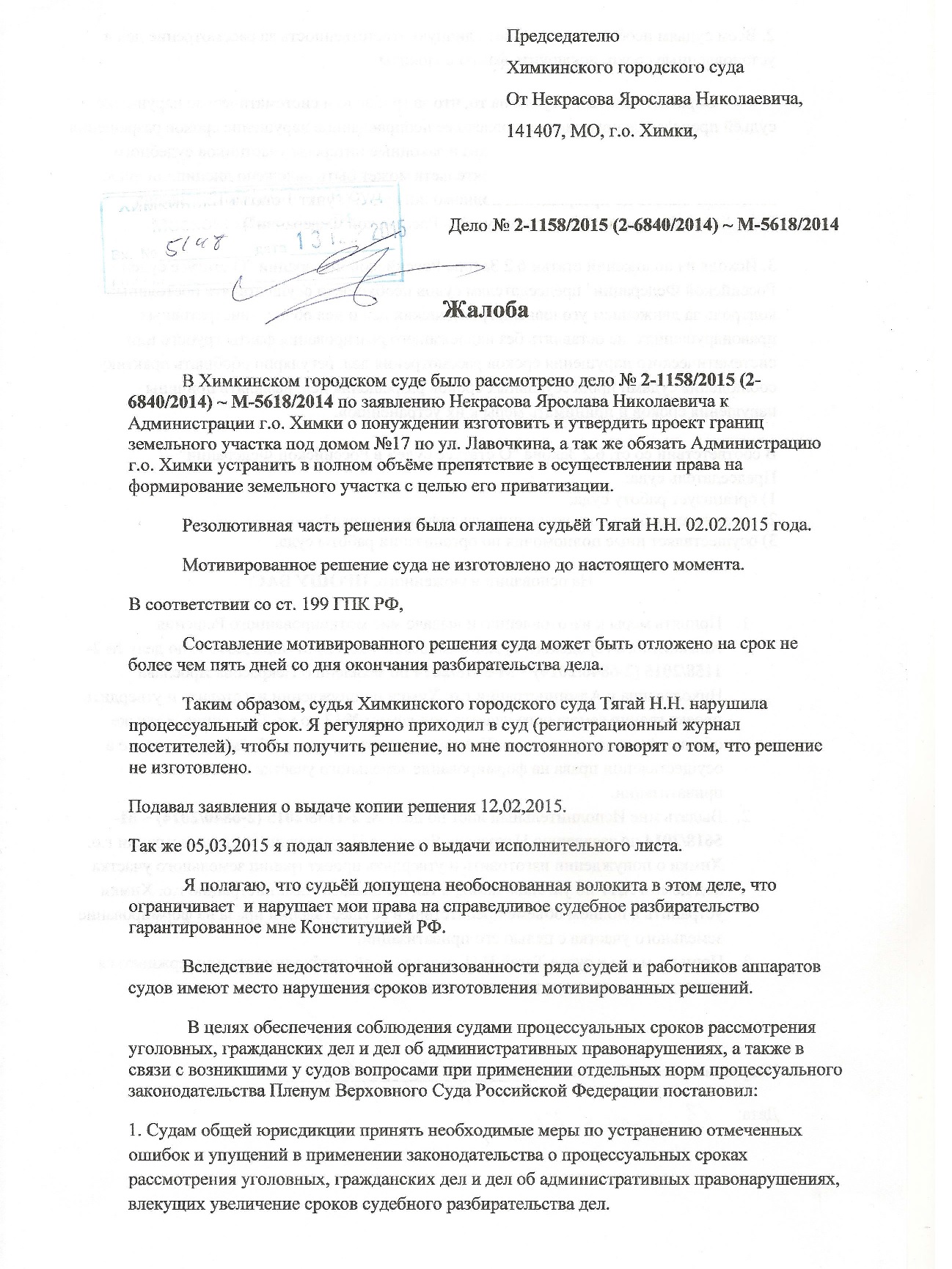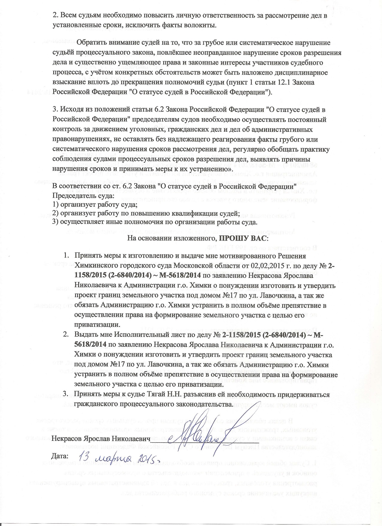 Активист с ул. Лавочкина Ярослав Некрасов подал жалобу в Химкинский городской суд в связи с необоснованной волокитой судьи Натальи Тягай. Дело в том, что до сих пор не изготовлена и не выдана мотивировочная часть решения, вынесенного Тягай по иску Некрасова к химкинской администрации еще в начале февраля. Между тем закон обязывает судей изготавливать решения в течение 5 дней с момента вынесения.
