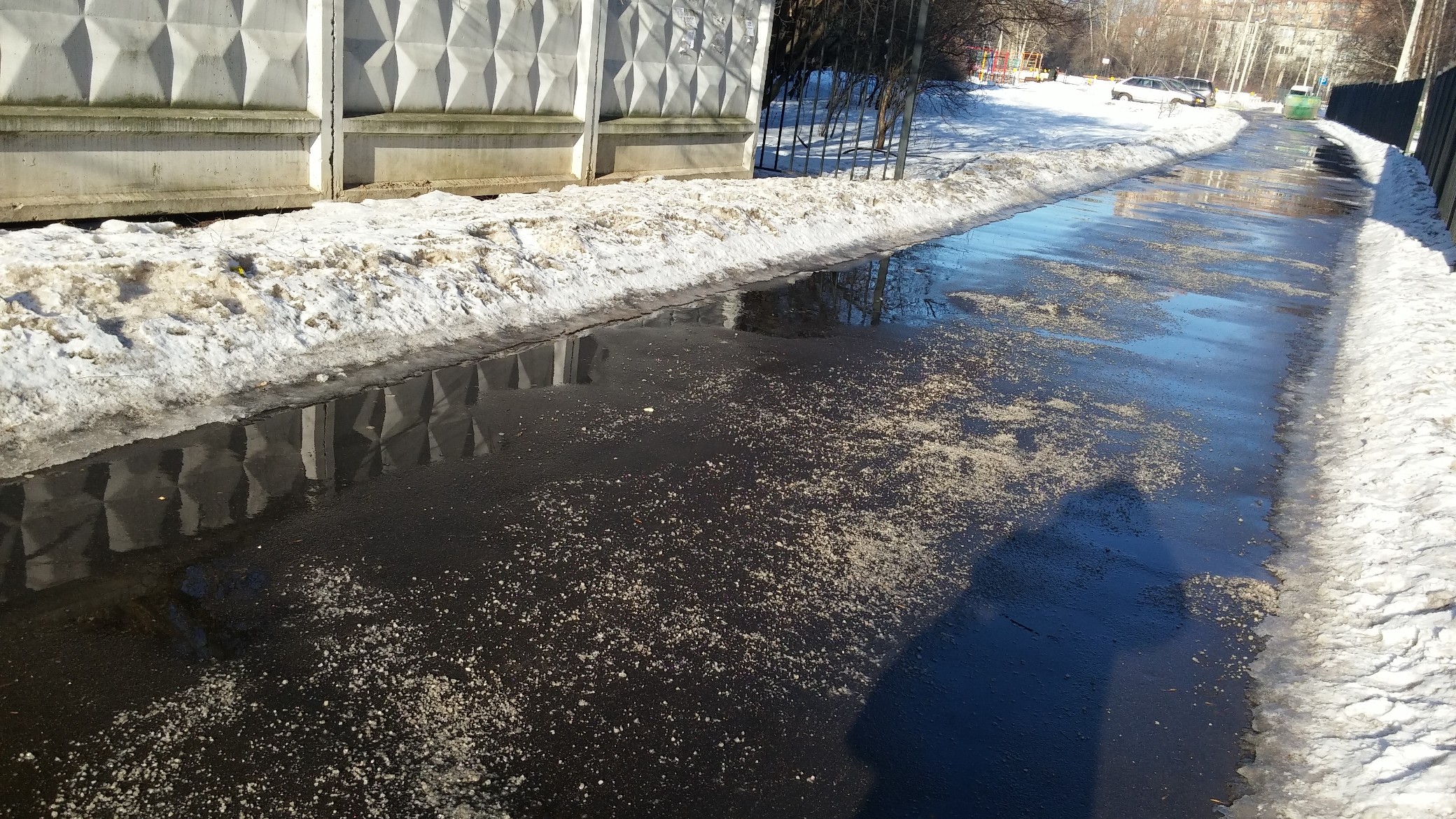 На улицы Химок продолжают в больших количествах сыпаться ядовитые для почвы, опасные здоровья людей и домашних животных, портящие обувь и машины, противогололедные реагенты.