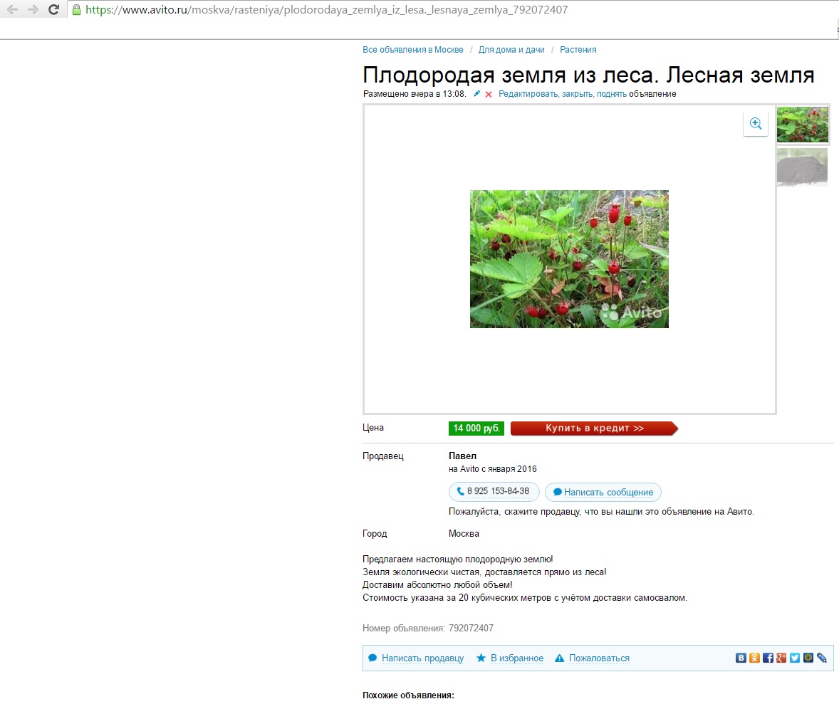 Некий пользователь Павел из Москвы опубликовал объявление на сайте Avito о продаже "плодородной лесной земли" в "неограниченных количествах". Стоимость - 14 тыс. рублей за 20 кубометров с доставкой.